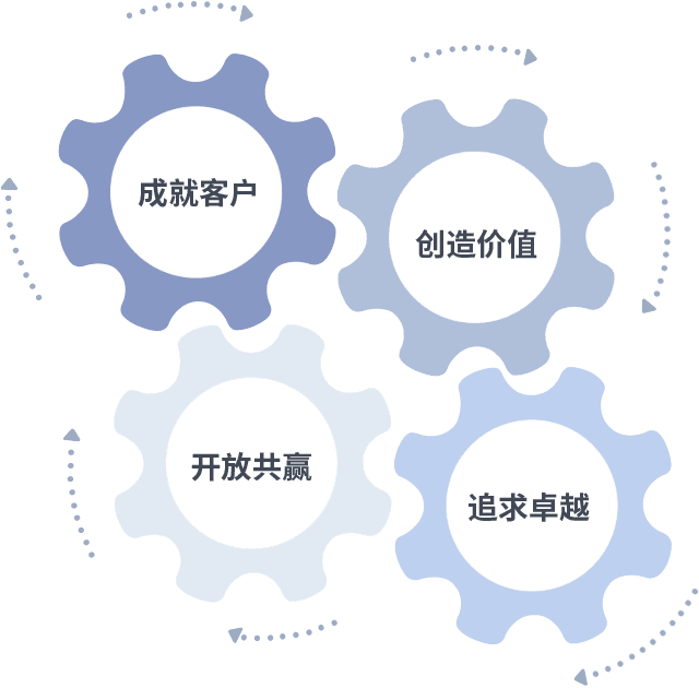 成就客户是一切决策的出发点,,,,创造价值是衡量所有工作的标准,,,,追求卓越是我们做事做人的态度,,,,开放共赢是我们的格局也是最终的结果。。。价值观的齿轮环环相扣,,,,推动着组织里的每个人不断向前。。