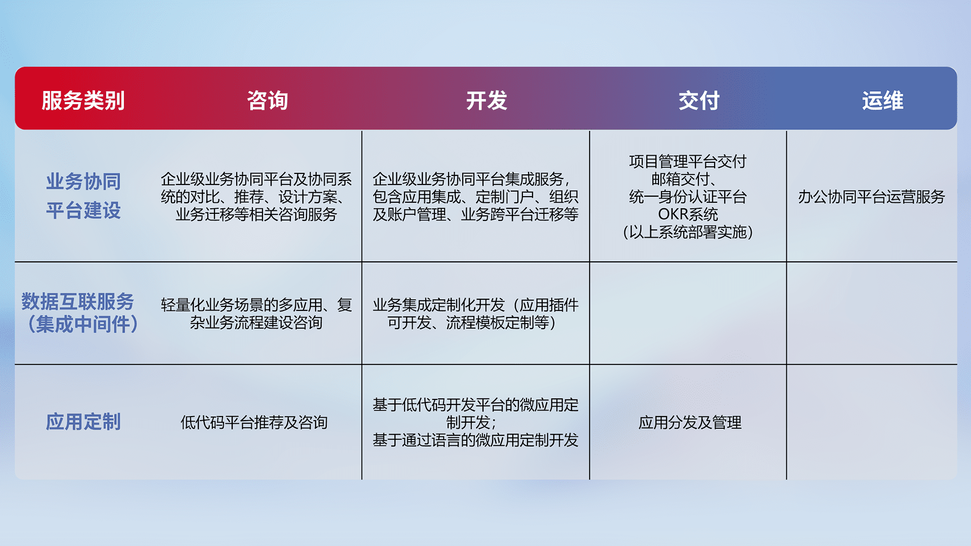 针对钉钉、、企微、、IDaas等平台级产品提供产品的规划、、方案、、、、交付、、、、定制化开发等服务,,,,实现如统一协同办公、、智能客户服务、、混合会议管理、、、智能数据查询、、、等业务场景,,,,实现数字化转型。。。